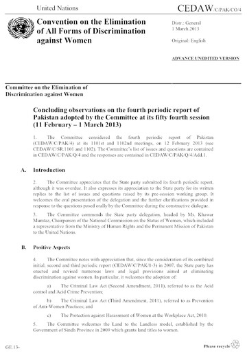 Concluding observations on the fourth periodic report of Pakistan adopted by the Committee at its fifty fourth session (11 February – 1 March 2013).