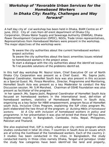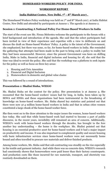 The Homebased Workers Policy workshop was held on 7th and 8th March 2017, at India Habitat Centre, New Delhi and attended by participants at Annexe 1. The agenda is at Annexe 2.