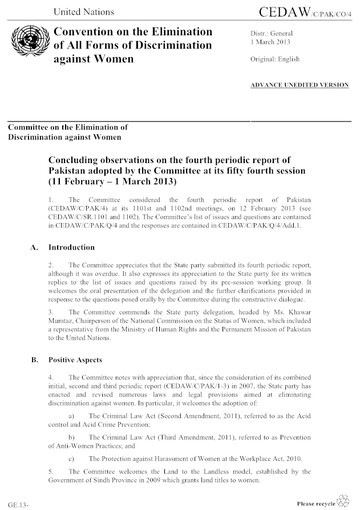 Concluding observations on the fourth periodic report of Pakistan adopted by the Committee at its fifty fourth session (11 February – 1 March 2013).